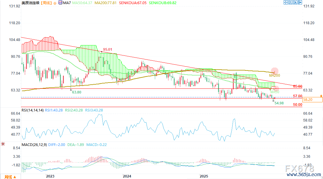 自2022年5月以来,WTI周线图呈现握续下行趋势,抛售动能再次推动价钱跌破60好意思元。2025年全年未出现权臣看涨修正,这一形态成为最关节的长久时代结构,将来数月或连接主导下行走势。尤其是当价钱跌破60好意思元、50好意思元等心境关隘下方的关节支握位时,下行趋势或进一步强化。唯有价钱守护在50周苟简移动平均线下方,2026年市集情谊或握续看空。