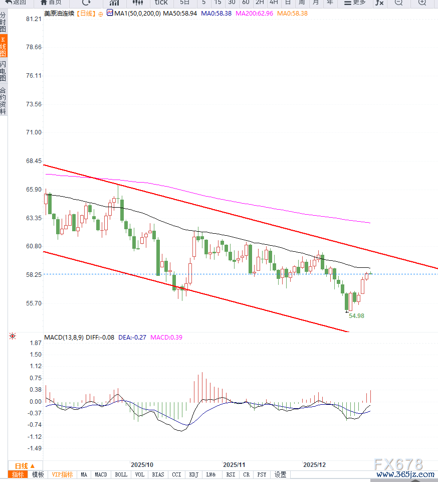 在工夫面上,好意思原油日线走势仍处于残障建立阶段。从花样看,价钱在此前快速着过期于57.8–58.0好意思元区域酿成阶段性补助,近期集会收出小阳线,裸露低位买盘运行介入,但反弹力度仍偏良善。