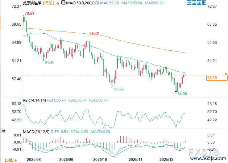 汇通财经APP讯——周四(12月24日)好意思盘时段,在因沐日裁减的交游时段内WTI原油期货小幅走高,但阛阓未能接续涨势。价钱一度涉及58.62好意思元的50%回撤位,并尝试向58.94好意思元的50日平均线连结,不外当日日内最高价仅为58.75好意思元,未涉及50日均线这一关节阻力位。随后买家兴味消退,走势堕入横盘。WTI原油期货盘中价钱为58.34好意思元/桶,跌幅0.07%。交游商正密切存眷50均线——若后续能有用打破该水平,可能赶快更动阛阓基调。